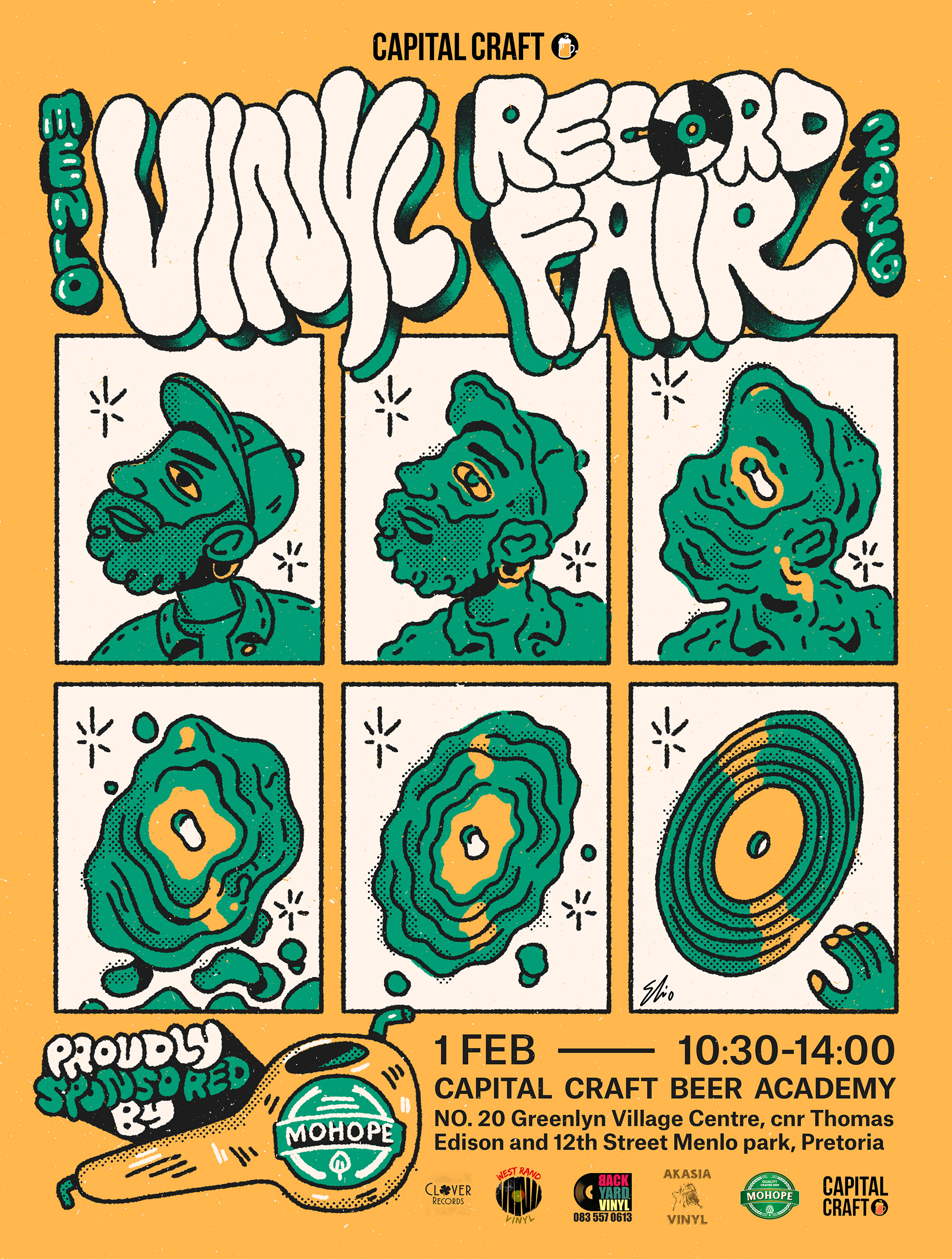 Poster for the 2026 Menlo Vinyl Record Fair featuring a man turning into a record.
