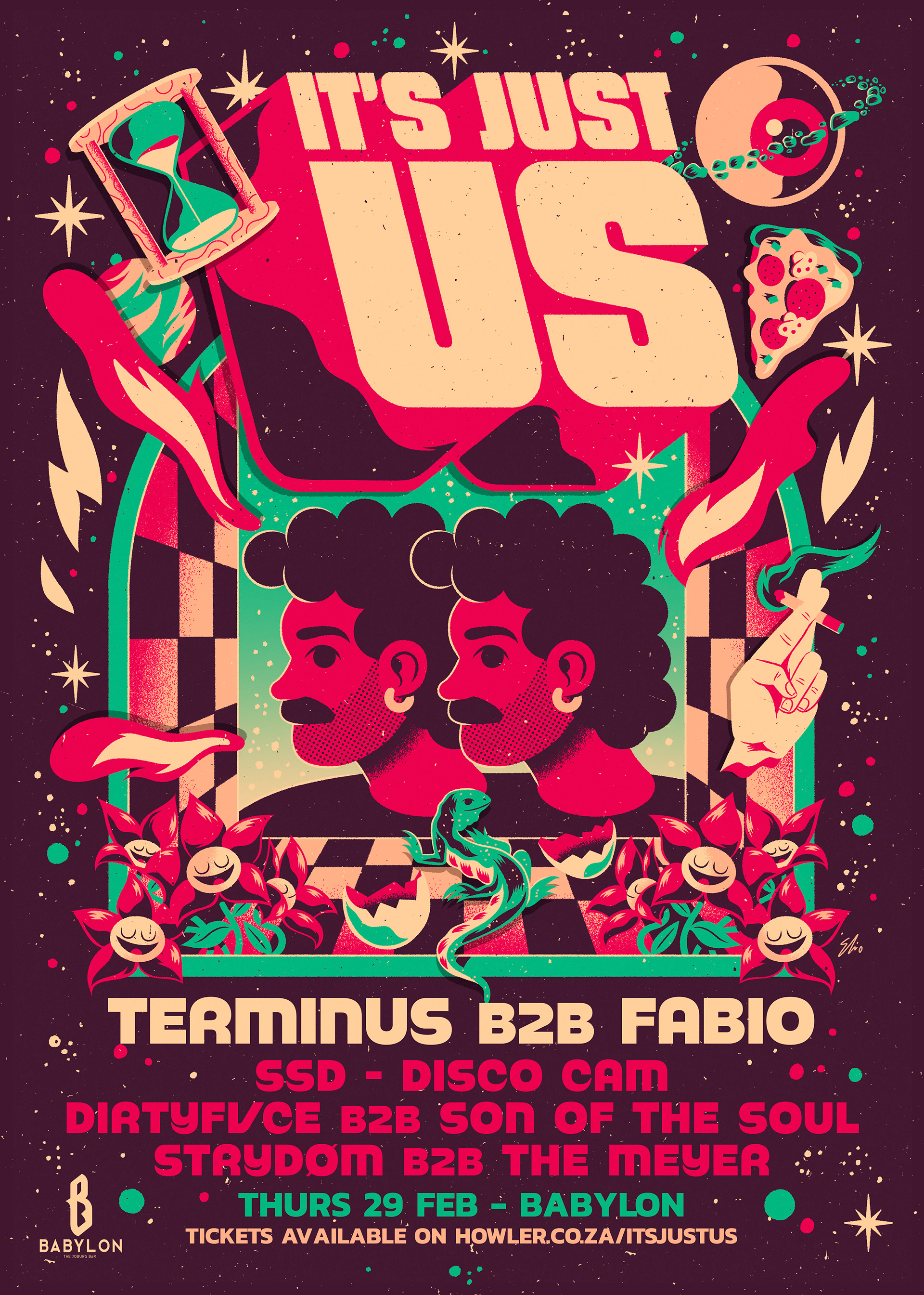 I created this poster for electro event It's Just Us. I had creative freedom on this one so I could go pretty wild with it.